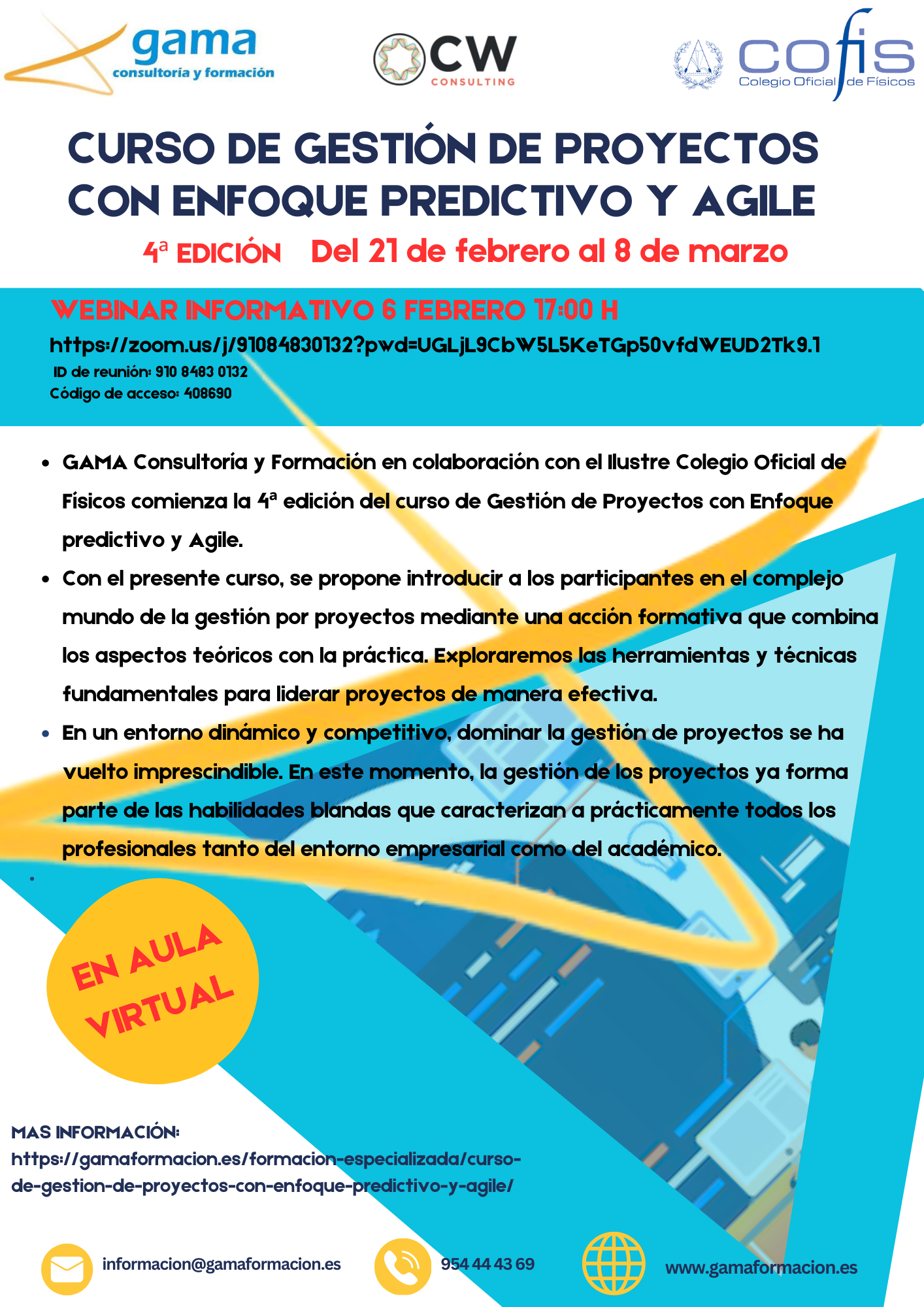 GAMA Consultoría y Formación, en colaboración con el Colegio Oficial de Físicos, organiza la 4ª edición del curso de Gestión de Proyectos con Enfoque predictivo y Agile.