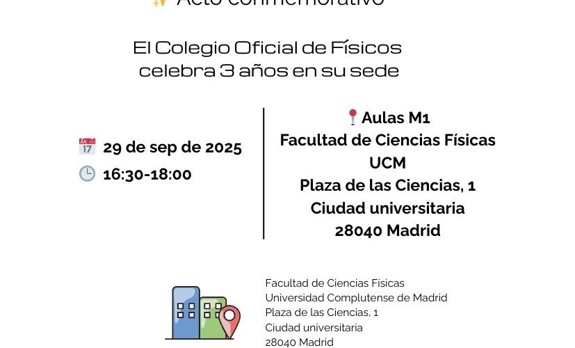 Un acto para reencontrarnos, reconocernos y seguir creciendo juntos 📅 29 de septiembre de 2025   📍Aula M1 de la Facultad de Físicas de la UCM Plaza de las Ciencias, 1Ciudad universitaria28040 Madrid   🕒 Programa 16:30   Registro 16:45   Bienvenida.  Marta María Arranz. Gerente Colegio Oficial de Físicos 16:50   Reconocimiento a D. Ángel Gómez Nicola… Leer más »